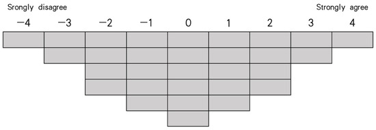 Based on the initial formation of the statement set, experts in nature conservation, staff from local protected area management agencies, and village committees were invited to offer optimization suggestions for the statements during field research. Statements with unclear meanings or redundant content were revised, and any missing content was added. During the interview process, two local villagers were selected to participate in this experiment, and the wording of certain sentences was tweaked to ensure there was no confusion after explanation by the interview organizer. Ultimately, the initial 37 statements were condensed into 30, which were then randomly numbered to create the Q-set (see Table 1). Q-sorting was based on a scale ranging from −4 (strongly disagree) to +4 (strongly agree) (see Figure 2). The 30 statements in the Q-set were filled in the corresponding cells of the scale by the respondents, forcing them to follow a quasi-normal distribution.