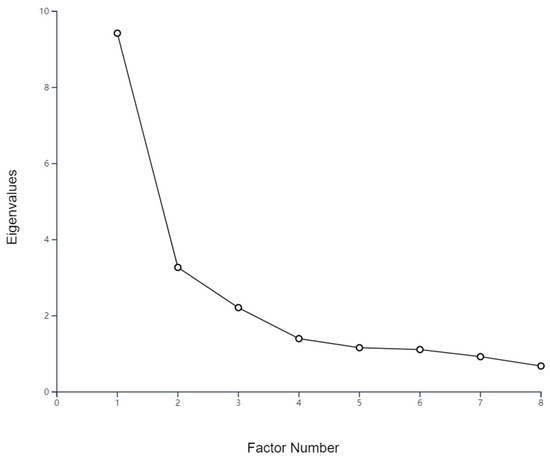 The essence of the analysis process is the inverted principal component analysis (PAC) method, which creates components based on the interviewee rather than declarative statements. Using Ken-Q Analysis (Version 2.0.1), first start by analyzing the correlation between each respondent’s Q-sorted data and all other respondent’s Q-sorted data and automatically generate a correlation matrix for the respondent’s Q-sorted data. Then output a table of eigenvalues for each factor (Table 2. Eigenvalues and Explained Variance for Factors) and a scree plot (Figure 3. Scree Plot Showing the Eigenvalues of Factors) by automatically performing a principal component analysis on the correlation matrix.