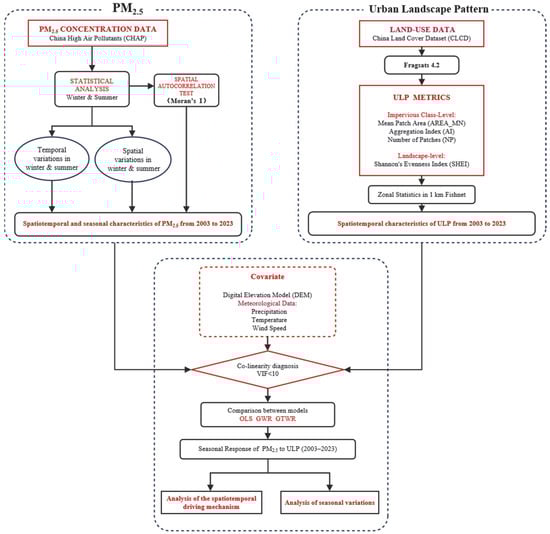 Prior research has provided substantial insights into the impact of ULP on PM2.5 concentrations. However, the long-term dynamics of the driving mechanisms of ULP on PM2.5 remain limited, and analyses of its seasonal mechanisms are conspicuously lacking. Furthermore, the majority of current research ignores the regulating function of fine-scale urban spatial structures in determining the distribution of pollution inside cities by using entire cities as the fundamental spatial unit [,]. This study takes Urumqi, a representative continental arid city in western China, as a case study, focusing on the spatiotemporal driving mechanisms of ULP on PM2.5 within the central urban area from 2003 to 2023. First, the annual spatial distribution patterns of PM2.5 were visualized using seasonal raster data. Then, four landscape pattern metrics—number of patches (NP), mean patch area (AREA_MN), aggregation index (AI), and Shannon’s evenness index (SHEI)—were calculated in 2003, 2008, 2013, 2018, and 2023. Combined with four control variables, the relationships between PM2.5 and ULP were examined at the five time points using ordinary least squares (OLS), the geographically weighted regression (GWR) model, and the geographically and temporally weighted regression (GTWR) model. The results from each model were compared and analyzed. Finally, the GTWR model was employed to reveal the spatiotemporal effects of ULP on PM2.5 concentrations. The overall workflow chart is illustrated in Figure 1. This study explores the evolving relationship between urbanization-driven landscape changes and air pollution variations in arid urban regions, seeking to understand their spatiotemporal linkages and offer insights for developing sustainable environmental management approaches.