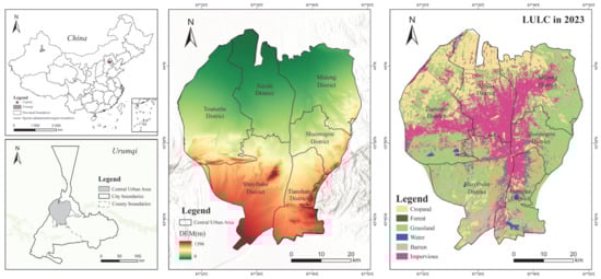 The central urban area of Urumqi (CUA) has been selected as the study area, which is an arid city in western China. It is located in an inland basin near the northern foothills of the Tianshan Mountains and is characterized by a moderate continental climate, which is susceptible to PM2.5 pollution. The specific scope is based on the Urumqi Master Plan (2011–2020). The CUA primarily comprises six administrative districts of Urumqi: the New Urban District, Toutunhe District, Tianshan District, Shayibake District, Midong District, and Shuimogou District, which are crucial to urbanization and industrialization. Figure 2 shows the study area’s extent alongside its 2020 land-use/land-cover (LULC) classification. Over the past two decades, Urumqi has experienced swift urbanization and a marked rise in industrial output and residential development, leading to considerable changes in the ULP and severe PM2.5 air pollution, especially in winter when unfavorable meteorological conditions exacerbate pollution accumulation.