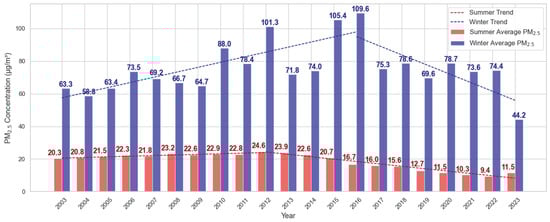 Comparison of Average Annual PM2.5 Concentrations of CUA in Winter and Summer (2003–2023).