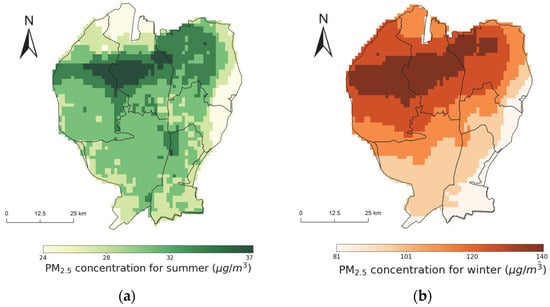 Spatial distributions of annual average PM2.5 concentrations in CUA: (a) summer PM2.5 concentration; (b) winter PM2.5 concentration.