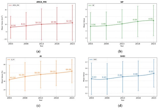 Temporal variations in ULP metrics: (a) temporal variation in AREA_MN (for five-year intervals: 2003, 2008, 2013, 2018, and 2023); (b) temporal variation in NP; (c) temporal variation in AI; and (d) temporal variation in SHEI.