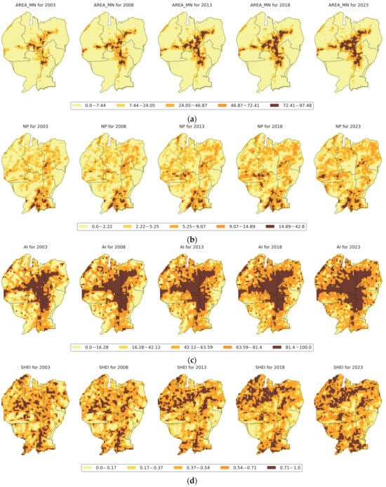 Spatial distributions of ULP metrics (for five-year intervals: 2003, 2008, 2013, 2018, and 2023): (a) spatial distribution of AREA_MN; (b) spatial distribution of NP; (c) spatial distribution of AI; and (d) spatial distribution of SHEI.