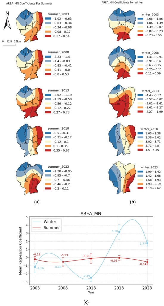 GTWR model regression coefficients for AREA_MN (for the years 2003, 2008, 2013, 2018, and 2023): (a) spatial distribution of summer AREA_MN coefficients; (b) spatial distribution of winter AREA_MN coefficients; and (c) temporal variation in AREA_MN coefficients.