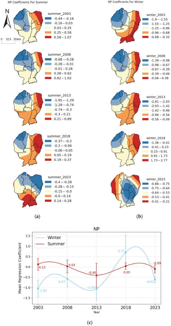 GTWR model regression coefficients for NP (for the years 2003, 2008, 2013, 2018, and 2023): (a) spatial distribution of summer NP coefficients; (b) spatial distribution of winter NP coefficients; and (c) temporal variation in NP coefficients.
