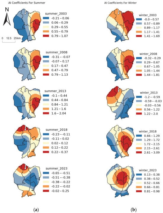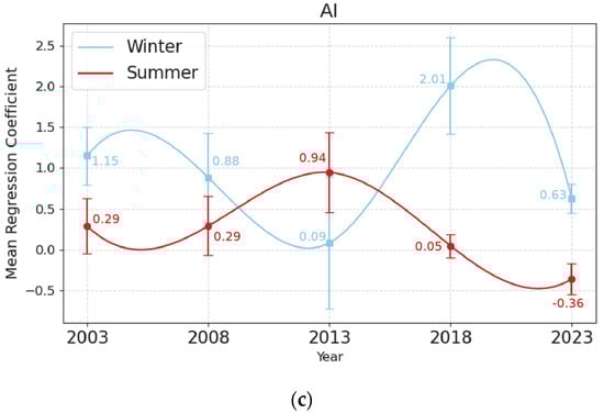 GTWR model regression coefficients for AI (for the years 2003, 2008, 2013, 2018, and 2023): (a) spatial distribution of summer AI coefficients; (b) spatial distribution of winter AI coefficients; and (c) temporal variation in AI coefficients.