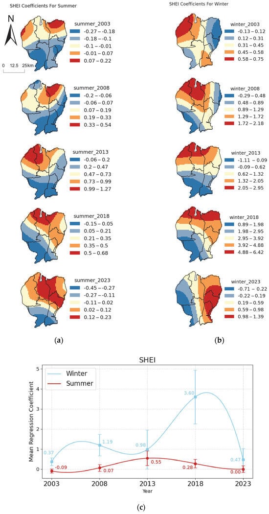 GTWR model regression coefficients for SHEI (for the years 2003, 2008, 2013, 2018, and 2023): (a) spatial distribution of summer SHEI coefficients; (b) spatial distribution of winter SHEI coefficients; and (c) temporal variation in SHEI coefficients.
