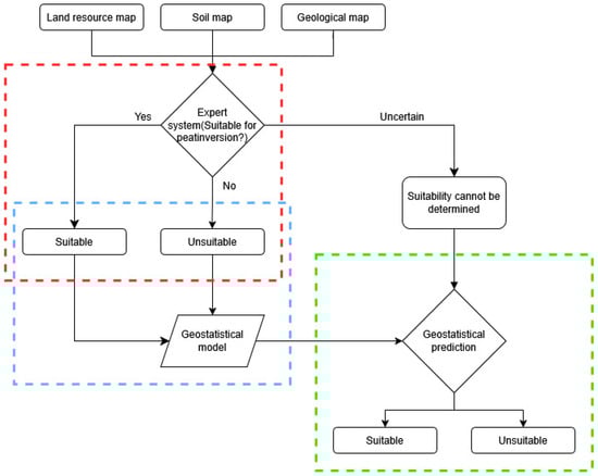 The objective of the present study was to develop a method for identifying cultivated peatland suitable for peat inversion in Norway. We used a simple, rule-based expert system [13,14], combining existing information about land resources, soil, and geology to assess the suitability for peat inversion in locations where this information was present. A geostatistical model [15,16] was successively added to predict suitability in areas where the data were insufficient to use the expert system approach (Figure 1).