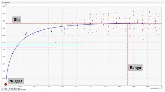 The statistical support for the geostatistical computations was collected from map polygons classified using the expert system described above. We found the geometrical centroid of each polygon and attached the assumed suitability (0/1) to these single-point locations. For each pair of points classified by the expert system, we calculated the distance (Euclidean straight-line distance) and the semivariance (half the squared difference between the two suitability values). Since the assumed suitability is a binary variable (0/1), the semivariance is either 0.0 or 0.5. The pairs of point locations were grouped into “lags” (a lag is an interval of distances), and the mean semivariance was calculated for all pairs of points in each lag, resulting in an empirical semivariogram (a graph representing the mean semivariance for each lag). Finally, a theoretical semivariogram (a function) was fitted to the graph and used in the prediction of suitability for peat inversion at locations where the suitability was unknown. The theoretical semivariogram is characterized also by three values: sill, range, and nugget. Figure 3 shows an example of a semivariogram. The sill is the semivariance value (along the y-axis) at which the model becomes flat; the range is the distance (in m along the x-axis) at which the model becomes flat; and the nugget is the semivariance value at which the model intercepts the y-axis (0 in this case). The geostatistical computation was performed using QGIS 3.34 with the SmartMap plugin v. 1.5 [26].
