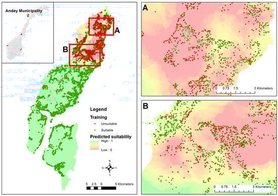 Predicted suitability for Andøy as a surface model, depicted as a continuous color scale from high suitability (green = 1.0) to unsuitable (red = 0.0). Training points are shown as green (assumed suitable) and red (assumed unsuitable) dots. Subfigures (A,B) are enlarged maps of the two rectangular areas labeled A and B in the main map. Base map Norge Digitalt.
