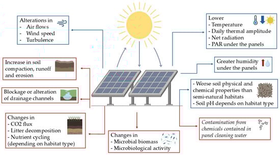 During the construction phase of the PVP facility, soil tillage, clearing and partial topsoil removal can lead to increased erosion and reduced soil aggregate stability, resulting in the degradation of soil physical quality compared to semi-natural and natural habitats (pinewood and scrubland; []). On the other hand, there is no consensus on the effects that the construction of PVPs has on soil carbon content, soil chemical properties, soil temperature or soil water content [,,]. Figure 1 summarizes the main impacts of solar panels on soil.