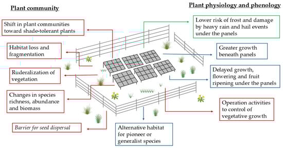 During the operation phase of PVPs, solar panels change microclimatic conditions (temperature, humidity and photosynthetically active radiation), which may result in changes in plant communities (see Section 5). Effects on vegetation growth and flowering and plant and animal species richness and abundance, among others, have also been detected (see Section 5.3 and Section 5.4).
