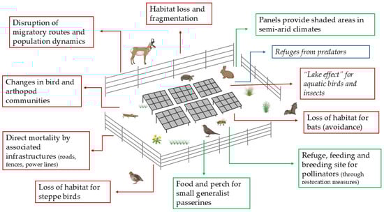 PVPs have both positive and negative impacts on wildlife (Figure 3). Some of these impacts affect virtually all animal groups, while others are specific to some groups. As previously explained, PVPs often require a large area of land, which can lead to the loss of habitats for wildlife []. Fencing PVPs modifies natural habitats, creating patched areas and increasing habitat fragmentation. This is of relevance to migratory species, as it can affect migration routes as well as resting, breeding or wintering sites. PVPs can also create barriers or disturbances that impede access to forage and water resources, mates or breeding sites. For instance, a study on pronghorn (Antilocapra americana) in North American rangelands found that PVPs reduced habitat connectivity and limited access to critical resources for both resident and migratory populations, thereby disrupting movement patterns and potentially impacting population dynamics and the ecosystem services they provide []. At the PVP scale, soil erosion, loss of vegetation cover and vegetation maintenance actions during utility operation also impact the habitat for wildlife and can increase the risk of local population decline [,].