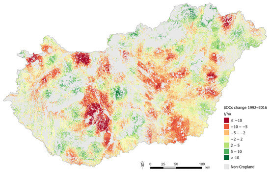 In Hungary, SOC stocks have declined in recent decades due to inappropriate soil use and management practices. Using machine learning combined with space–time geostatistics, Szatmári et al. [] created a series of maps illustrating the changes in SOC stocks in Hungary from 1996 to 2016 []. Their mapping campaign relied on SOC data derived from the Hungarian Soil Information and Monitoring System (SIMS). SIMS was established in 1992 with the objective of collecting geographically referenced information on the chemical and biological change of Hungarian soils at 1236 monitoring sites, covering evenly the whole territory of the country. SOC is measured every three years according to the Hungarian standard (MSZ-08-0452:1980) []. In Figure 2, a SOC stock change map between 1992 and 2016 is presented based on Szatmári et al. maps, masked with non-agricultural areas from the ecosystem map of Hungary []. Note that the map refers to the topsoil (0–30 cm).
