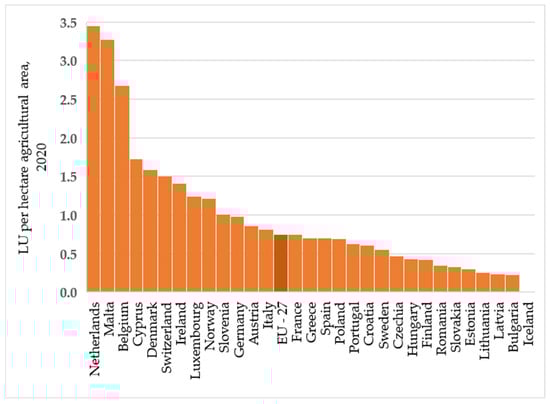 Livestock density in the EU countries and the average value for the EU-27, 2020. Source: Eurostat [].