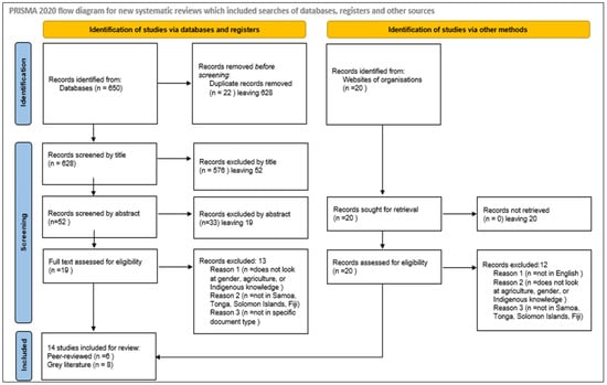 Data were extracted from papers included in the scoping review using a piloted form developed by the authors. The data extraction flow is summarised in Figure 1. The data extracted included specific details about participants, concepts, context, study methods and key findings relevant to the review question. All study details are captured in Table 2. The final number of records analysed was 14, with 6 academic papers and 8 studies from the grey literature. The larger number of germane studies from grey literature may be explained by the fact that most research on linkages between gender, agriculture and food production in the Pacific Islands is performed by international agencies such as UN Women as part of their remit to empower women economically and politically.