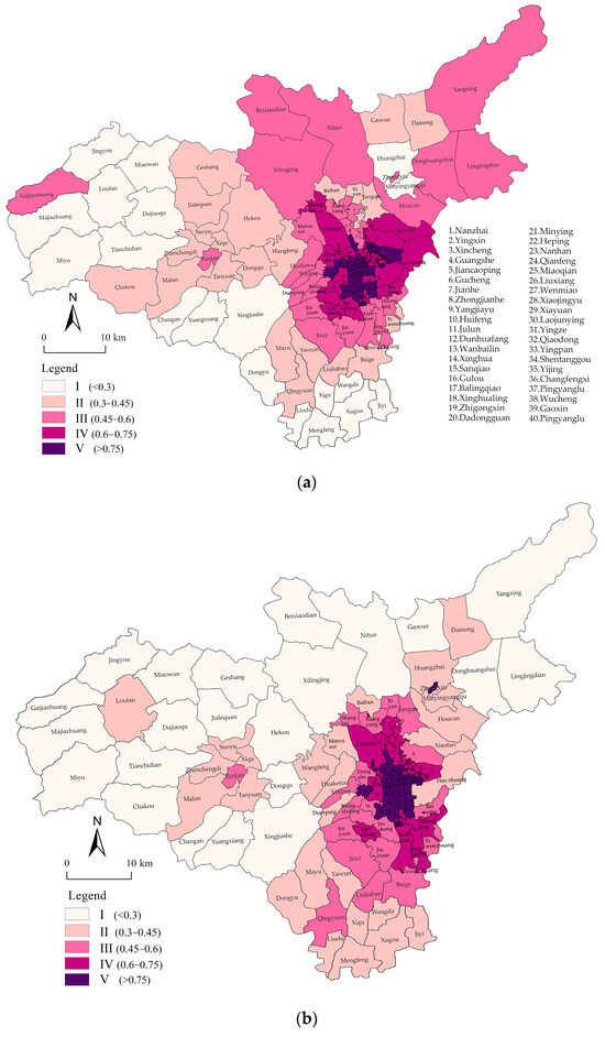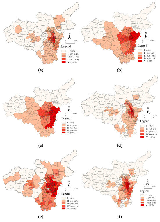 The spatial distribution of cultural values, as predicted by the MaxEnt model, was visualized at the subdistrict level (Figure 6). We categorized cultural values into five distinct levels (I-V), ranging from low to high, to facilitate a nuanced analysis of the spatial heterogeneity of cultural ecosystem services across the urban landscape. Taiyuan City’s distinctive geographical configuration engenders pronounced spatial heterogeneity in the CES supply. A consistent spatial gradient was observed across native esthetics, recreational leisure, knowledge educational, and historical–cultural services, with supply capacities diminishing from the central area towards the north and south. Notably, recreational, educational, and historical cultural services exhibited a relatively higher supply in the northwestern region than in the northeastern area. Conversely, the spatial distribution of inherent esthetic services showed an inverse pattern, with higher values in the northeast and lower values in the northwest.