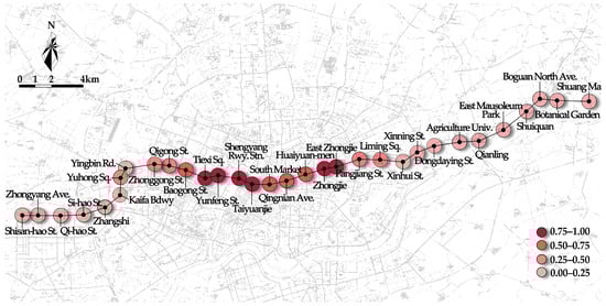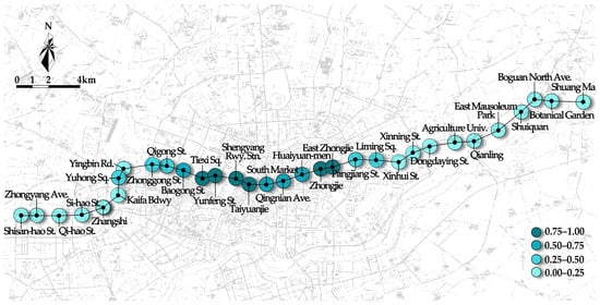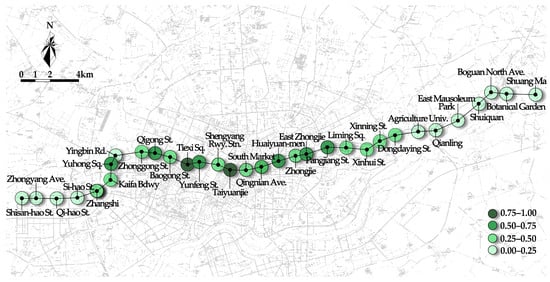 - Nodal value reflects the transportation service function and value presented by metro stations as urban transportation nodes. The number of station entrances and exits (N1) (Reusser et al. [45]), the number of directions served by the station (N2) (Reusser et al. [45]), and the number of bus stops in the station domain (N3) (Reusser et al. [45], Kim et al. [46]), ease of bus transfer (N4) (Bertolini et al. [47]), and accessibility to the city center (N5) (Kim et al. [46], Bertolini et al. [47]) are five indicators.