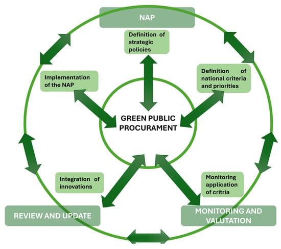 The adoption of NAPs can be characterized as a circular process comprising several interconnected steps, as illustrated in Figure 2. This process involves the formulation of policy strategies at the national level, aimed at integrating environmental criteria into public procurement. National and priority criteria are established based on an analysis of the specific context and needs of the country, identifying sectors where the implementation of GPP can yield significant environmental and economic benefits. Subsequently, the monitoring of the actions undertaken and the objectives set by the member state through the NAP is anticipated, enabling the review and updating of plans to incorporate improvements in contract selection criteria and overarching strategies, while considering advancements in technology, market developments and regulatory changes.