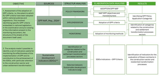 This study aims to evaluate the integration of GPP criteria within the NAPs of the Member States of the European Union, with particular attention to the application of these criteria in construction and urban settlement transformation projects, underlining how the adoption of design strategies compliant with the principles of GPP not only contributes to reducing the environmental impact of public works but also offers significant economic benefits for contracting authorities, improving efficiency in the use of resources and promoting a more sustainable development model. The importance of integrated strategic actions capable of directing urban transformation towards outcomes of environmental quality, resilience and territorial regeneration is highlighted, promoting intersectoral approaches involving policies, design and governance. Figure 4 illustrates the methodological pathway undertaken to attain the study’s objective; it outlines two main objectives, the sources consulted, the structure of the documents analyzed, the categories of data extracted and the results derived from this process. Objective n.1 was to evaluate the extent to which GPP criteria have been adopted, specifically by assessing the integration of EU GPP criteria into national policies and regulatory frameworks. This required the identification of concrete criteria embedded in national legislation. The analysis was carried out by examining and interpreting the content of official monitoring documents, using their internal structure as a methodological reference. Objective n.2 aimed to identify a set of indicators suitable for monitoring the effectiveness of GPP’s implementation and its contribution to the achievement of the Sustainable Development Goals (SDGs), with a particular focus on the construction sector and the transformation of urban environments.