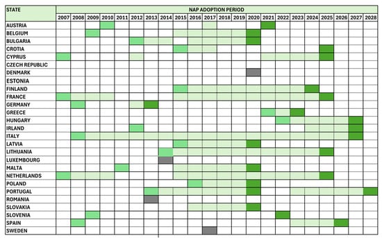 Adoption of NAP GPP in EU States. (Source: Own elaboration. Legend: Light Green: First NAP GPP adoption, Medium Green: NAP GPP update, Dark Green: Year up to which the last NAP update is valid, Gray: First and last NAP update coincide, Empty Cell: No NAP adopted that year).