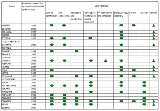 Adoption of GPP criteria referring to the latest PAN GPP update of each State. (Source: Own elaboration. Legend: Green triangle: criteria with a direct link to building interventions and urban transformation processes; Green ellipse: criteria with an indirect link, i.e., relevant to urban sustainability but not directly related to building activity).