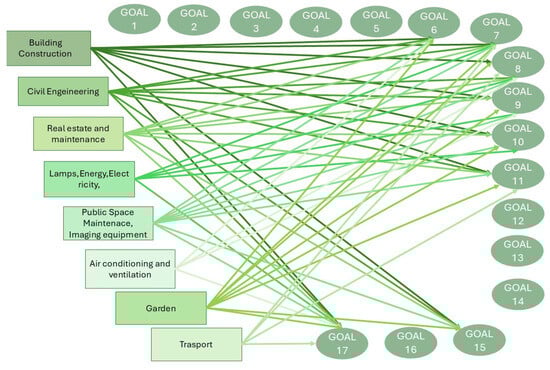 From the comparative analysis of the NAPs of the Member States, a relevant element concerned the possibility of integrating the GPP objectives with the Sustainable Development Goals (SDGs) of the 2030 Agenda. In the final phase of the elaboration, a process of the recognition and mapping of the GPP objectives already adopted at national level was conducted, with the aim of assessing their consistency and alignment with the targets set out in the SDGs, with a view to regulatory and strategic integration. This comparison has made it possible to identify common areas of action, particularly in the construction and urban settlement transformation sector, where the interconnection between environmental criteria applied to public procurement and global objectives such as the fight against climate change (SDG 13), responsible consumption (SDG 12), urban resilience (SDG 11) and energy efficiency (SDG 7) is more evident (Figure 7).