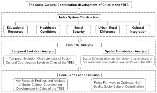 Socioculturally coordinated development extends beyond the integration of cultural industries, encompassing cross-regional integration and the coordination of public services, such as education and healthcare. From a meta modernist perspective [25], sociocultural collaboration is no longer viewed as the static integration of cultural functions, but as a dynamic, oscillatory process of anchoring shared meanings and collective identities across temporal and spatial scales [26]. In general, current studies on regional coordinated development are predominantly confined to the analysis of individual subsystems or sectors in selected regions, while systematic investigations into sociocultural subsystems and dynamic cross-regional assessments of urban coordination remain insufficient. Accordingly, this study aims to construct a comprehensive indicator system to systematically evaluate the overall level and performance characteristics of coordinated sociocultural development in the Yangtze River Economic Belt. In addition, spatial disparity analysis and autocorrelation methods are employed to reveal the spatial evolution and dynamic patterns of urban coordination across regions. The conclusions and policy recommendations derived from this study not only provide new academic perspectives but also offer important references for decision-making regarding the implementation of coordinated development strategies in the Yangtze River Economic Belt (Figure 1).