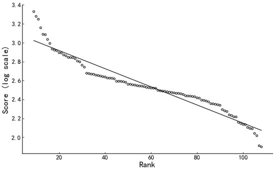 The social and cultural coordination capacities of cities along the Yangtze River Economic Belt approximately follow Zipf’s rank-size distribution. After excluding extreme values, the log of the coordination scores and their corresponding ranks yielded a goodness of fit of 92.13% (Figure 2). The top 10 and bottom 10 cities deviated slightly from the overall rank-size distribution curve, particularly those in the top 10, suggesting some decentralisation in social and cultural coordination across cities. This indicates the existence of a hierarchical pattern in the rank distribution of the coordination capacity, highlighting the need for further enhancement. The objectives of narrowing the gaps between cities and promoting balanced development are essential for improving regional social and cultural coordination.