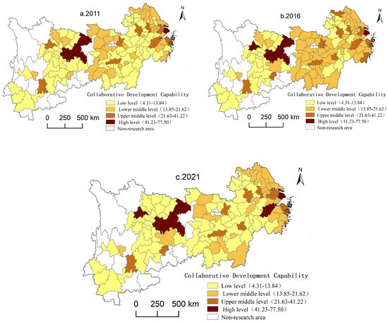 The analysis of social and cultural coordination among cities in the Yangtze River Economic Belt shows that the eastern region is more developed than the western region, with a core–periphery distribution in certain areas. From 2011 to 2021, the gap between regions widened, especially between the upper and lower reaches of the Yangtze River. The lower reaches, covering three provinces and one municipality, continued to lead by a large margin compared to the entire region, presenting a stepped stratification relative to the middle and upper reaches (Figure 3). In 2021, among the top 50 cities, 26 were from the lower reaches, accounting for 63.41% of all lower-reach cities; 18 were from the middle reaches, accounting for 42.85% of all middle-reach cities; and 6 were from the upper reaches, accounting for 22.22% of all upper-reach cities. Social and cultural coordination in the lower reaches of the Yangtze River continues to maintain a significant advantage, whereas the upper reaches are slightly weaker than the middle reaches in terms of coordination. From a provincial perspective, in 2021, aside from Shanghai and Chongqing, the cities in the top 50 for social and cultural coordination were mainly distributed in the lower reaches of Jiangsu and Zhejiang and the middle reaches of Hunan.