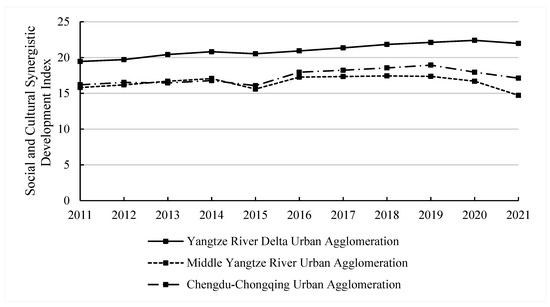 Changes in social and cultural coordination development capacity of three major city Clusters in Yangtze River Economic Belt from 2011 to 2021.