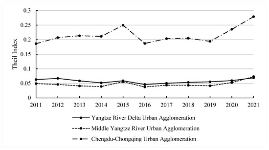 Theil Index of social and cultural coordination development of three major city clusters in Yangtze River Economic Belt from 2011 to 2021.