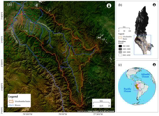 Geographic location of (a) Utcubamba Basin, located in the (b) Amazonas Department in the (c) northwest of Peru.
