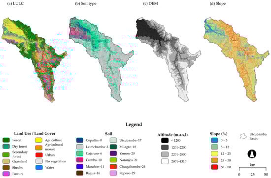 The 2024 LULC map obtained in the previous step was used as input (Figure 2a); land cover types were reclassified to match SWAT codes, as reported in previous studies conducted under similar topographic conditions in Colombia and Ecuador [25,59]. Soil type data with a spatial resolution of 250 m were obtained from SoilGrids: Global Information on Grid Soils [60]. The majority of the basin area is covered by Andosols (Leimebamba-3, Marga; 59.89%) and Cambisols (Cajaruro-6, Clay Grass; 26.69%), as depicted in Figure 2b. The same DEM used for LULC classification at a 30 m spatial resolution (Figure 2c) was also used to derive slope surface (Figure 2d), and subsequently to delineate sub-basins within the Utcubamba Basin using QSWAT version 2.0.1 within QGIS ver. 3.34.