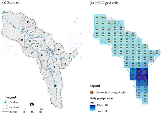 Sub-basin delineation (a) and PISCO grid cell distribution (b) within Utcubamba Basin.
