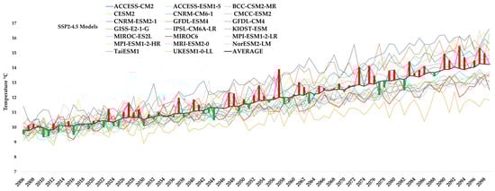 Time series of annual average temperature projections from 20 most commonly used global climate models (GCMs) for South America under SSP2–4.5 scenario. Each colored line represents individual GCM, while black line indicates ensemble average. Red and green vertical bars indicate the intermodel variability for each year, with red bars showing the upper deviation and green bars the lower deviation from the ensemble mean, highlighting the uncertainty range across GCMs.