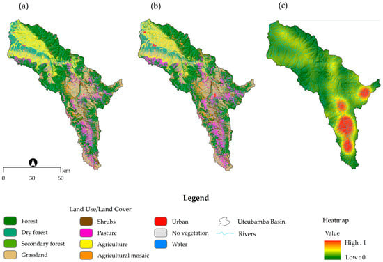 Land use and land over (LULC) map for 1990 (a), LULC map for 2024 (b), and heatmap of change concentration in the Utcubamba Basin (c).