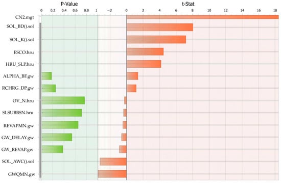 Monthly streamflow records from 2002 to 2010, obtained from the Naranjos hydrological station, were used for calibration, and data from 2011 to 2016 supported the validation process. The calibration was carried out in SWAT-CUP version 5.1.6, focusing on sensitivity analysis to identify the most influential parameters in the basin. Using the SUFI-2 algorithm, as applied in previous studies [15,26,74], fourteen parameter options were selected, where the sensitivity of each parameter was assessed based on p-values and t-statistics, measures commonly used to evaluate performance in hydrological models employing SWAT-CUP [74,75].