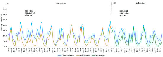 The Utcubamba River Basin exhibits a clear seasonal hydrological regime, with peak flows typically occurring between December and March, and low flows recorded between June and August. On a daily scale (Figure 8a), simulated streamflow values using the PISCO dataset for the 1987–2016 period reflect strong short-term variability, ranging from below 5 m3/s during dry periods to over 350 m3/s during peak events. At the monthly scale (Figure 8b), this pronounced seasonality is also captured, where average flows fluctuate between approximately 10 m3/s and 300 m3/s. The calibration and validation of the SWAT model yielded good performance (KGE = 0.74), indicating the model’s ability to reliably reproduce the basin’s hydrological dynamics.