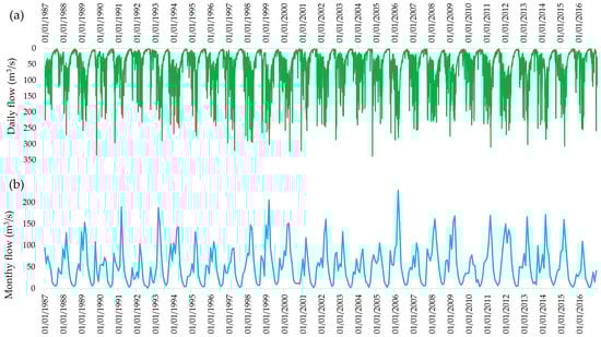 Historical streamflow in Utcubamba Basin from 1987 to 2016 using PISCO climate data: (a) daily flow variability; (b) monthly average flow patterns.