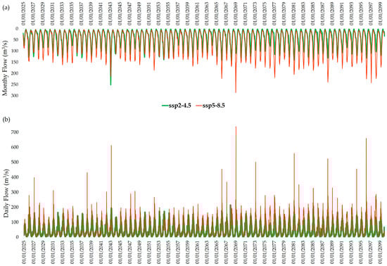 Projected streamflow in Utcubamba Basin under climate scenarios SSP2–4.5 and SSP5–8.5: (a) monthly flows; (b) daily flows for period of 2025–2100.