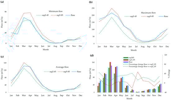Projected minimum (a), maximum (b), and average (c) monthly flows, and percentage changes (d) under SSP2–4.5 and SSP5–8.5 scenarios for 2025–2099, compared to historical baseline (1987–2016).