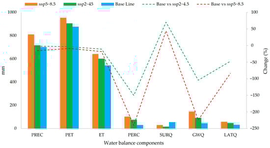 Projected changes in water balance components (PREC, PET, ET, PERC, SURQ, GWQ, LATQ) under SSP2–4.5 and SSP5–8.5 scenarios, compared to historical baseline (1987–2016).