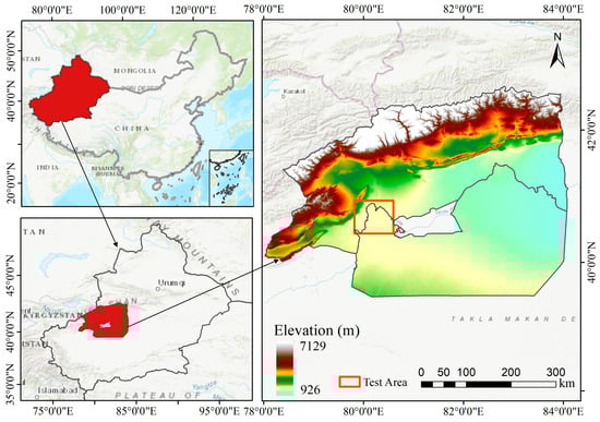 The Xinjiang Uygur Autonomous Region is located in northwestern China, with the Aksu Region situated in its central part. It is bordered by Bayin’guoleng Mongol Autonomous Prefecture to the east, Kizilsu and Kizilsu Kyrgyz Autonomous Prefectures to the west, Hotan Region to the south, and Yili and Kazakh Autonomous Prefectures to the north (Figure 1). The total area of the Aksu Region is approximately 1.32 × 106 km2, accounting for 8% of Xinjiang. The topography follows a north-to-south gradient of high mountains, plains, oases, and desert transition zones, with terrain that is elevated in the north and lower in the south, sloping from northwest to southeast. The northern part contains many mountain peaks, while the central region features gravelly fan-shaped foothill zones, alluvial plains, and Gobi areas interspersed with oases. The middle and low hill belts include large areas of well-watered natural grassland characterized by flat terrain, abundant water, and fertile land. The region lies within the arid zone of northwest China and is characterized by dryness and low rainfall, long periods of sunshine, annual sunshine duration of 2750–3029 h, and total solar radiation ranging from 5340 to 6220 MJ/m2. Winters are dry and cold, while summers are dry and hot.