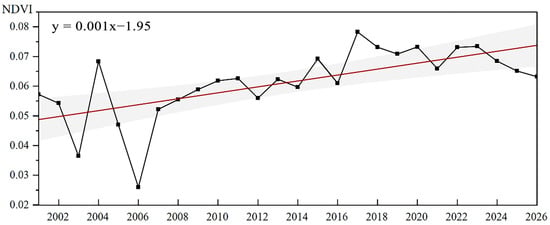 Temporal variation and linear fitting of annual mean NDVI in the Aksu region (2001–2026).