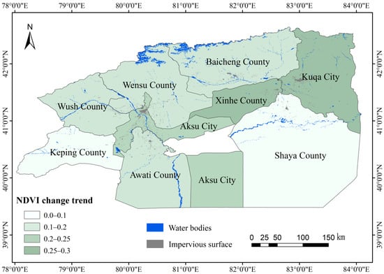 Spatial distribution of mean interannual NDVI variation trends in the Aksu region, Xinjiang, China (August 2001–2026).