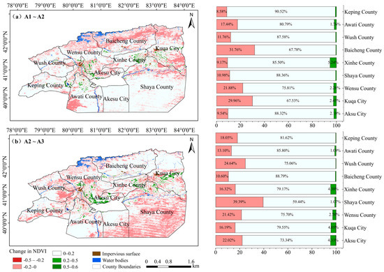 Spatiotemporal dynamics of NDVI variations in the Aksu region across distinct temporal phases. (a) Spatial distribution of NDVI changes from Stages A1 to A2; (b) spatial distribution of NDVI changes from Stages A2 to A3.