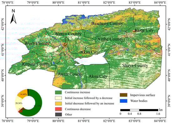 This study examined the NDVI change process across different stages in the Aksu region (Figure 5) by identifying typical change types that affected more than 1% of the area. The predominant NDVI change type was a continuous increase, accounting for 61.12% of the total area. Areas that experienced an increase followed by a decrease accounted for 20.36% of the total valid pixels, while those experiencing a decrease followed by an increase accounted for 14.60%. Areas with a consistent decrease in NDVI were relatively small, representing only 2.6% of the total area. These NDVI change patterns reflect temporal variations in vegetation activity across the study area, providing insights into the dynamics of vegetation cover over the study period. Overall, the results suggest a general trend of vegetation improvement during the study period. In terms of spatial distribution, pixels with a continuous decrease in NDVI were mainly located in Kuqa City, the junction of Shaya County and Xinhe County, and northern Aksu City. The centers of these areas largely coincide with regions characterized by high impervious surface density and increased human activity, suggesting that urban expansion and land use changes may be the primary drivers of the continuous NDVI decline observed in these regions. In contrast, pixels with a continuous increase were more evenly distributed across the region. Pixels that first increased and then decreased were mainly distributed in Shaya County, Koping County, Wush County, Aksu City, and southern Wensu County. Pixels that decreased and then increased were mainly distributed in northern Baicheng County, northern Kuqa City, and southwestern Awati County.