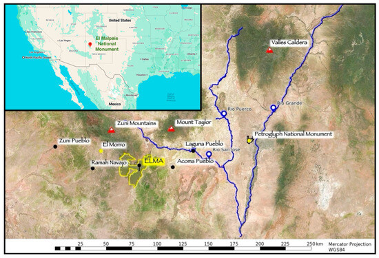 El Malpais National Monument in northern New Mexico, USA, is a distinctive geologic landscape with profound cultural significance (Figure 1). The name El Malpais, Spanish for “the badlands,” aptly describes its rugged terrain characterized by extensive ancient lava flows, cinder cones, ice caves, and lava tubes, predominantly composed of black basalt. These features are remnants of a prolonged volcanic history that lasted roughly 700,000 years, marking one of the longest volcanic sequences in the United States [1]. The McCartys lava flow is the most recent formation within this sequence, dating back approximately 3900 to 3200 years ago [2].